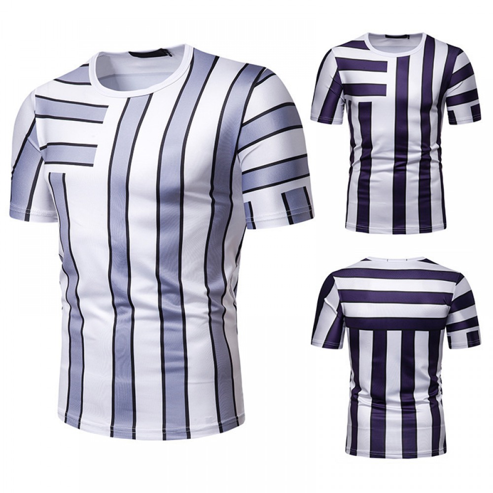 New Summer Men's Short-Sleeved T-Shirt Mens Contrast Striped Slim Casual T-Shirt